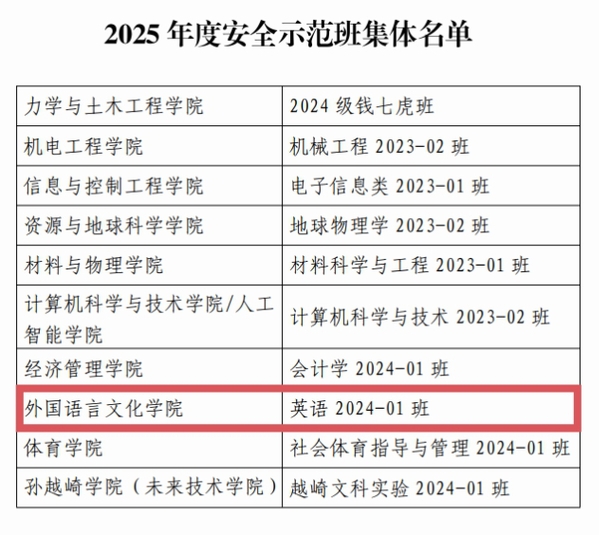 近日,学校公布了《关于表彰2025年度安全示范班集体的决定》,成人游戏 英语2024-1班荣获“2025年度安全示范班集体”荣誉称号。这是成人游戏 连续第三年在校级安全示范班集体评选中获此殊荣,充分体现了成人游戏 在班级安全建设方面的持续深耕与扎实成效。