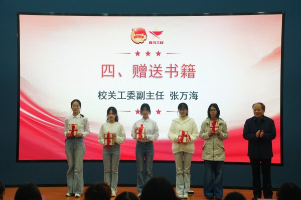 张万海为学员代表赠送《习近平谈治国理政》《论共产党员的修养》等理论学习书籍,校团委副书记徐彤彤为青马班授旗,青马班班主任闫瑾为上一期学员代表颁发结业证书。培训班学员赵梦辰同学作为学员代表发言。