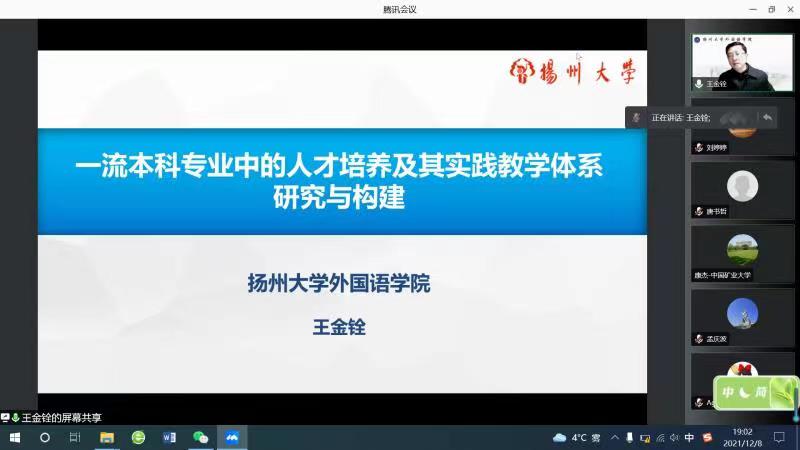 12月8日晚19时,扬州大学外国语成人游戏 院长王金铨教授在腾讯会议以为成人游戏 教师进行题为“一流本科专业中的人才培养及其实践教学体系研究与构建”的专题讲座。本次讲座由外文成人游戏 科研副院长祖大庆主持,外文成人游戏 教学副院长刘婷婷、英语系基层教学组织负责人和成人游戏 部分老师参加了此次讲座。